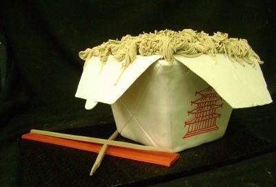 This sculpted 3-D take out box cake was inspired by Charm City Cakes (Ace of Cakes on The Food Network). This custom cake will serve at least 30 guests as shown. The chopsticks are created with sugar fondant icing and the box is also covered and decorated with sugar fondant icing. The pagoda is hand drawn [...]