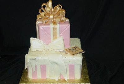 admin2016-09-02T03:33:38-04:00This two tier birthday cake present would serve at least 40-50 guests. Both tiers on the birthday cake are decorated with sugar fondant icing. The bow is hand painted with gold shimmering luster dust. Then the entire birthday cake presentation is sprayed with pearlized shimmering luster dust. This present birthday cake was enjoyed in Atlanta, [...]